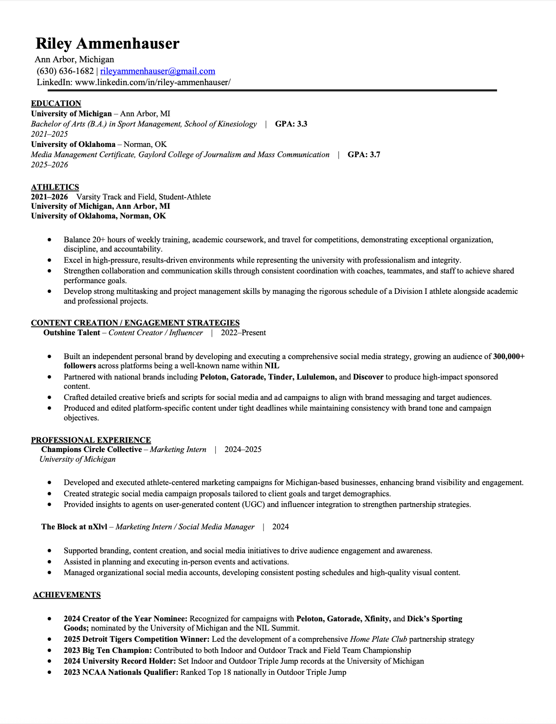 Assisted in the development of social media campaigns for student-athletes at the University of Michigan, crafting strategic brand collaboration proposals to foster meaningful partnerships. Created detailed creative briefs and managed the content production process, overseeing the posting schedule to ensure all brand and athlete deliverables were met seamlessly. Focused on aligning campaign objectives with brand messaging, audience engagement, and performance metrics to maximize impact.
